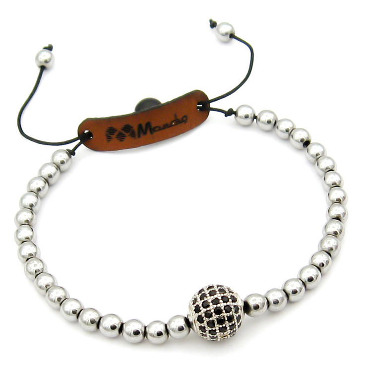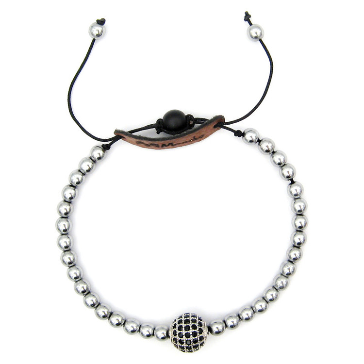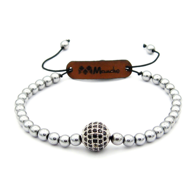 ساخته شده از: یک گوی سواروسکی نگین دار نه رنگ نقره ای با نگین های مشکی با ابعاد حدودی 1 در 1 سانتی متر به همراه مهره های طبیعی سنگ حدید (هماتیت) به رنگ نقره ای با ابعاد حدودی 0.6 در 0.6 سانتی متر با قابلیت تغییر اندازه (فری سایز)
