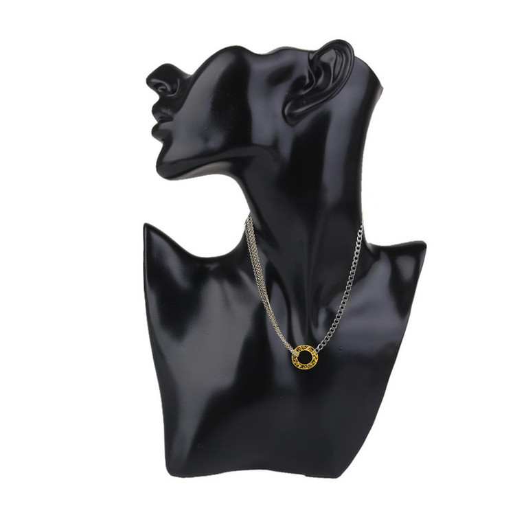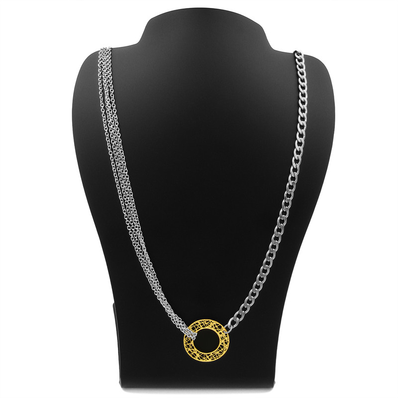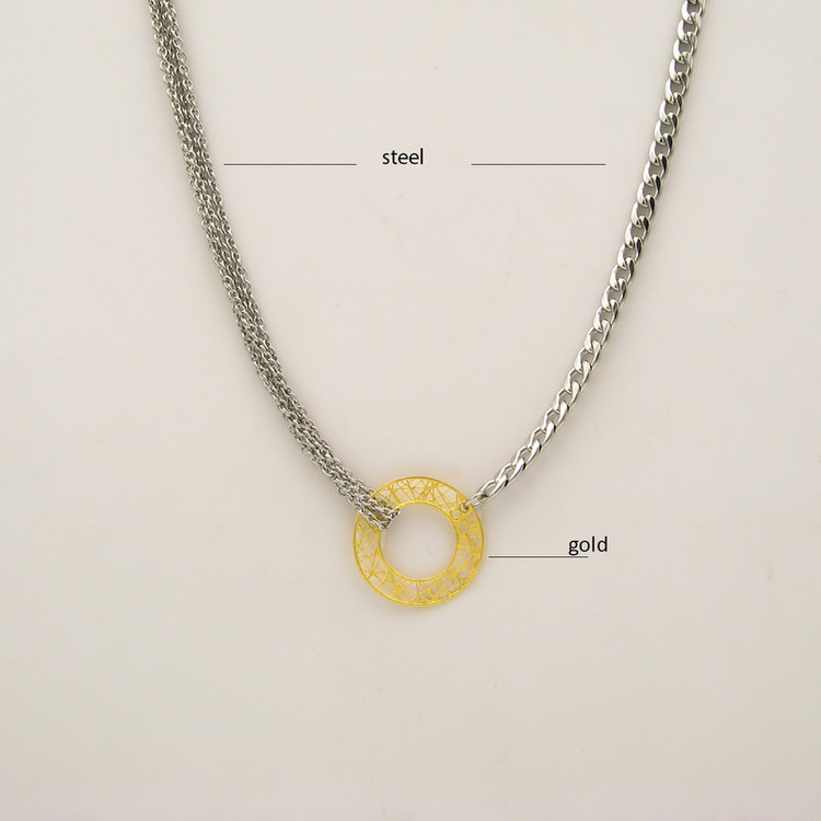 پلاک طلا 18 عیار حلقه ای توری با زنجیر های ترکیبی استیل / این گردنبند شامل دو مدل زنجیر استیل طرح کارتیر و حلقه ای به رنگ نقره ای است.