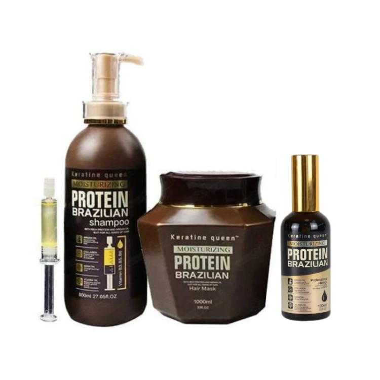 پک شامپو، ماسک و روغن مو بدون سولفات کراتین کویین برزیلی مدل پروتئین (حجم 1000 + 800 + 100 میل)