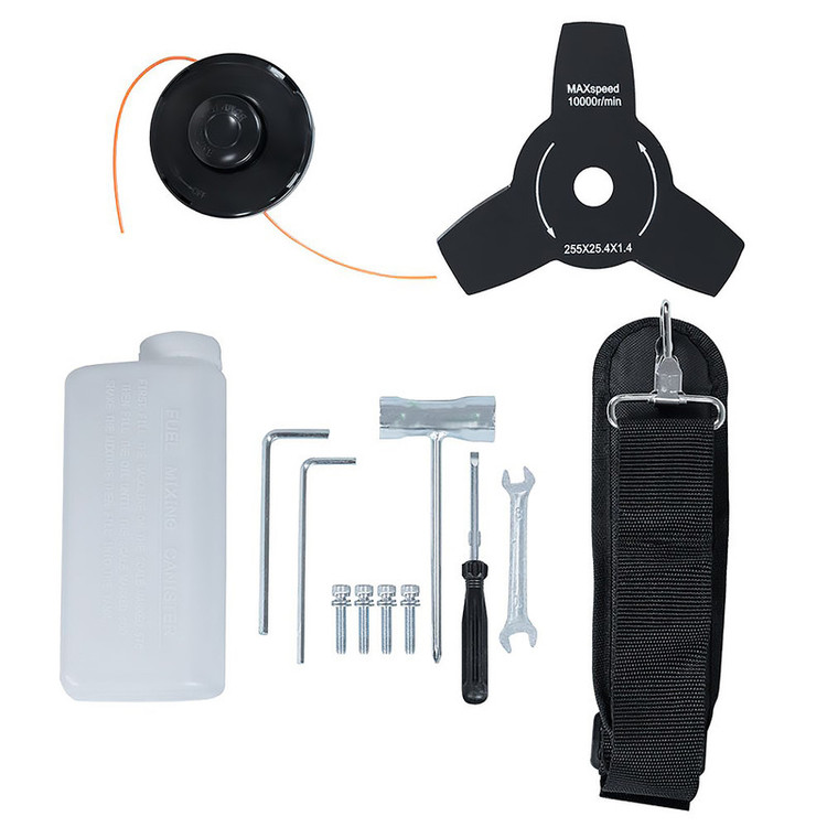 این دستگاه بصورت دوشی میباشد و موتور ان دوزمانه میباشد یعنی بنزین و روغن با هم مخلوط شده و در باک ریخته میشود،و به غیر از تیغه های خودش دارای یه الحاقی روتیواتور هم میباشد.