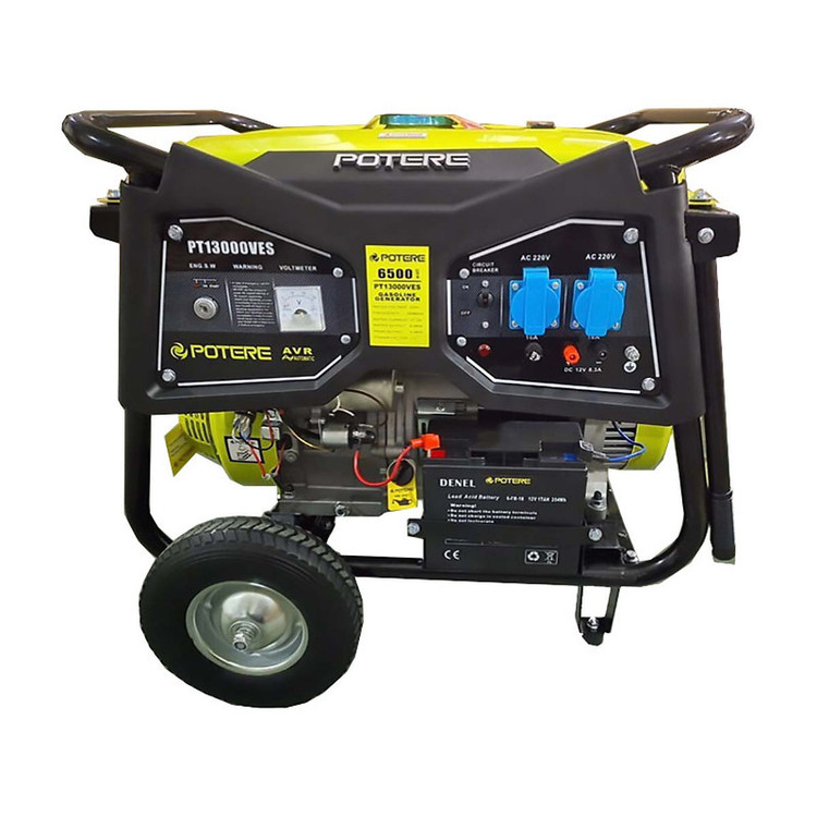 مشاهده محصولات مرتبطموتور برق POTERE یکی از موتور برق های با کیفیت و قیمت مناسب می باشد که مدل PT13000VES توان 6.5 کیلو وات یا 6500 وات با خروجی تک فاز می باشد، سیستم استارت این موتور برق به صورت دستی و الکتریکی بوده و نوع سوخت آن بنزینی است، جهت سهولت حمل نقل این مدل دارای چرخ بود و به همراه باطری به مشتری ارائه می شود. ویژگی دیگر این دستگاه وزن مناسب این مدل می باشد این موتور برق برای مصارف خانگی ، باغی ، کارگاهی و صنعتی مناسب بوده و با استفاده از این موتور برق شما می توانید 65 لامپ صد واتی ، یخچال ، کولر گازی ، کولر آبی ، پمپ آب ، کفکش ، پنکه ، بتونر ، بالابر ، دریل ، فرز ، دستگاه جوش 200 آمپر و غیره استفاده کنید.