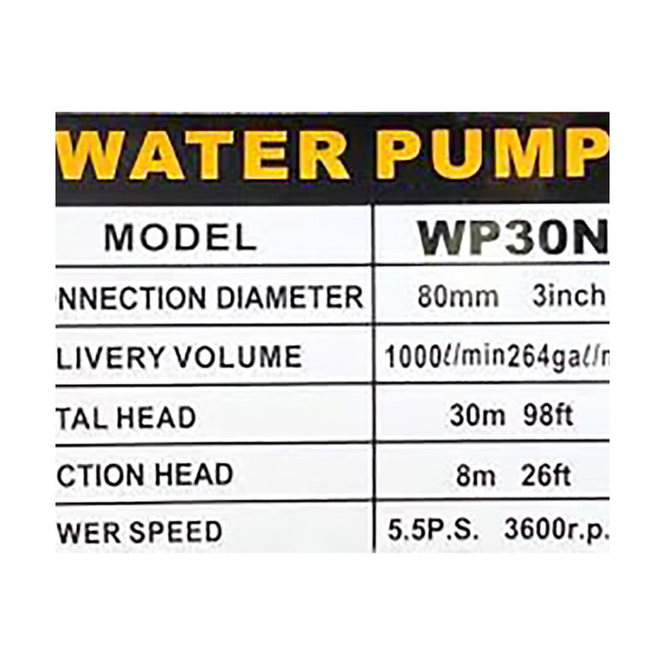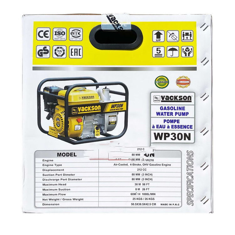 محصولی که اکنون مشاهده می کنید پمپ و موتور آن هر دو ساخت چین می باشند. موتور پمپ واکسون 3 اینچ مدل VACKSON WP30N برای عملکرد از سوخت بنزین استفاده می کند و قطر دهانه ورودی و خروجی آن 3 اینچ می باشد همچنین این موتور پمپ می تواند آب را از ارتفاع 8 متر عمودی مکش کرده و تا ارتفاع مفید 30 متر عمودی یا 450 متر افقی ارسال نماید.