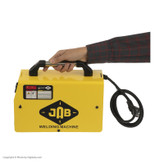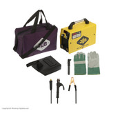 اقلام همراه1/5 متر کابل جوشکاری، 1/5 متر کابل اتصال، انبر اتصال، انبر جوش، ماسک جوشکاری، فرچه تمیز کننده به همراه چکش گل زن، کیف ابزار برزنتی و دستکش جوشکاری