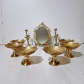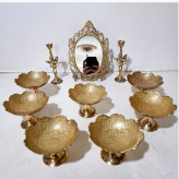 هفت سین برنجی هندی 10تکه با طرح طاووس آینه و شمعدان و7عدد پیاله پایه بلند مناسب استفاده دائم و قابل شستشو بدون تغییر رنگ