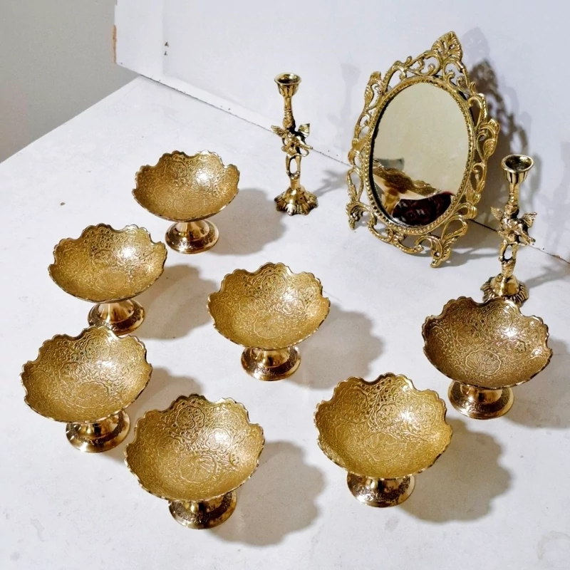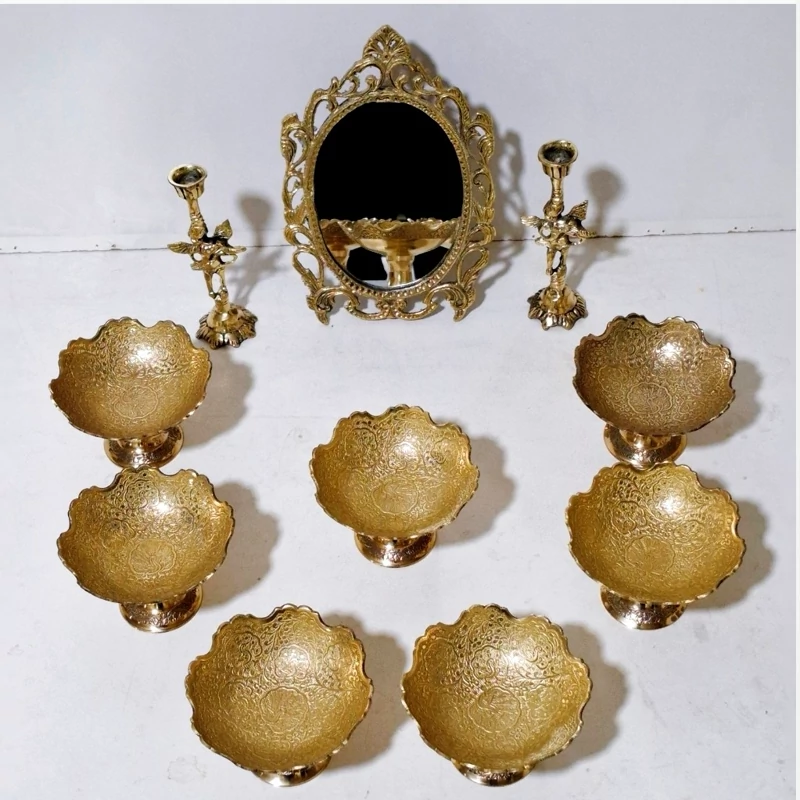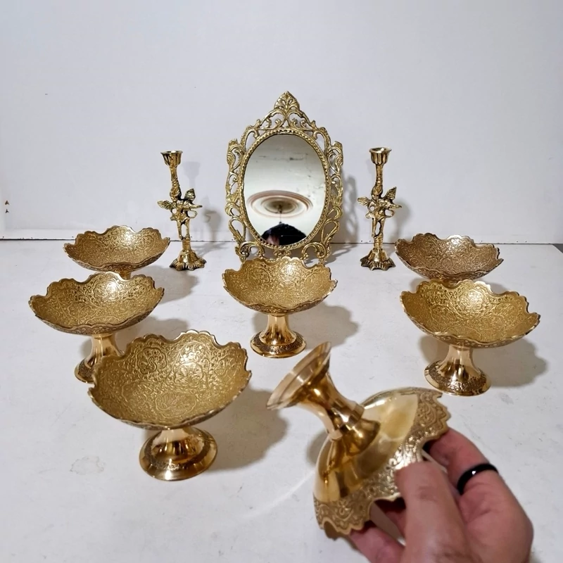 هفت سین برنجی هندی 10تکه با طرح طاووس آینه و شمعدان و7عدد پیاله پایه بلند مناسب استفاده دائم و قابل شستشو بدون تغییر رنگ