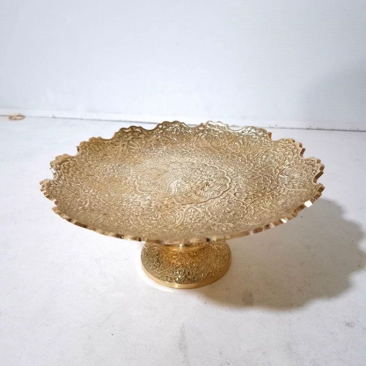 شیرینی خوری تمام برنجی قطر 22 سانتیمتر با طرح طاووس و با سطح کیفیتی درجه یک بسیار زیبا و ضخیم ساخت مناسب برای استفاده دائم و قابل شستشو بدون تغییر رنگ