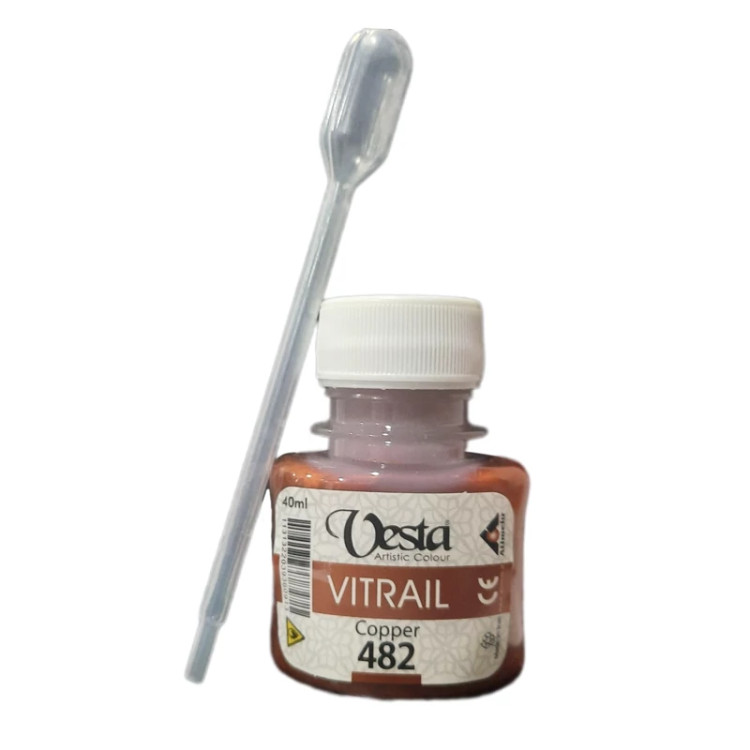 نقاشی روی شیشه یا ویترای هنری است که توسط رنگ های ویترای بر روی ظروف شیشه ای جهت زیبا شدن این ظروف انجام می گیرد. ویترای ۴۰ میلی رنگ مسی برند وستا، مقاوم در برابر نور ، همراه با قطره چکان