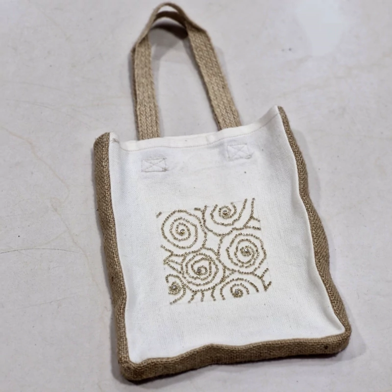 ساک پارچه ای گل دوزی شده با نگین (طرح مارپیچ) سایز کوچک 20 در 25 (توت بگ گل دوزی شده با نگین)