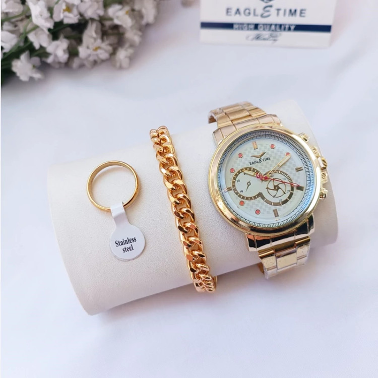 ساعت مچی مردانه دستبند انگشتر رینگی ست طلایی
