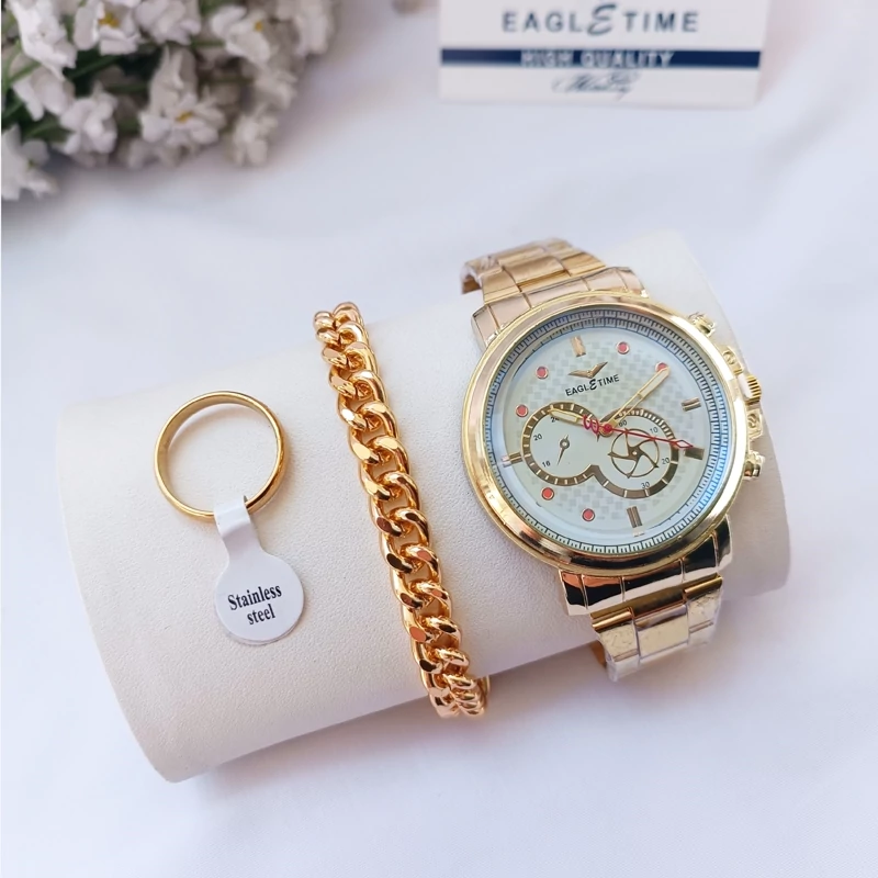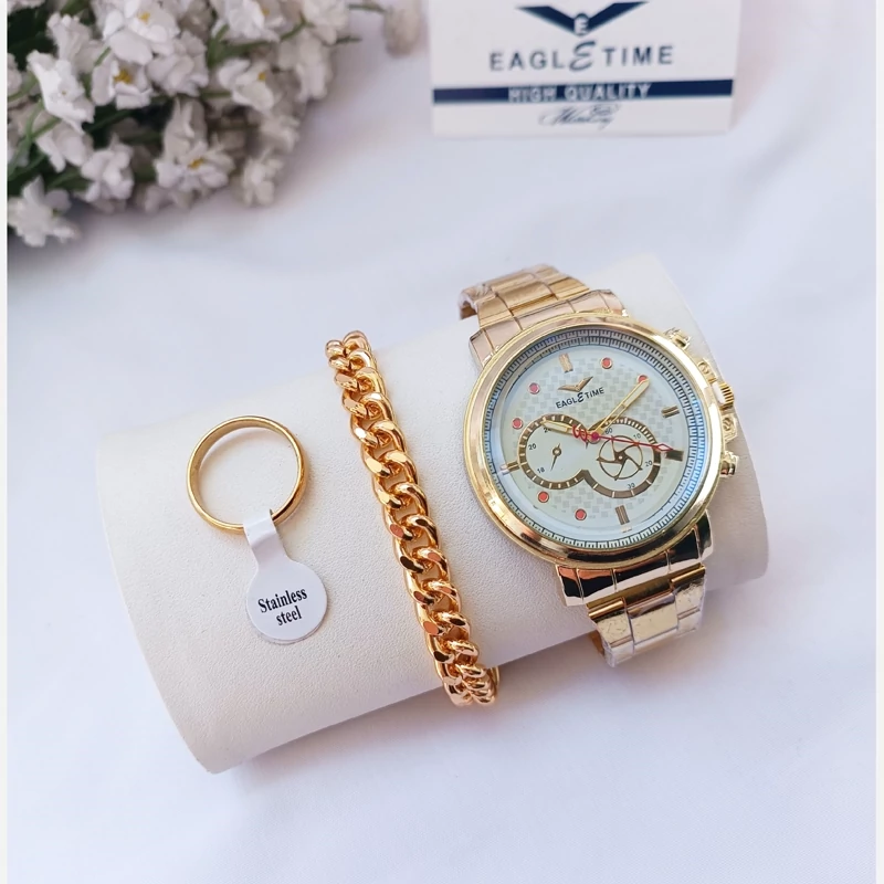 ساعت مچی مردانه دستبند انگشتر رینگی ست طلایی